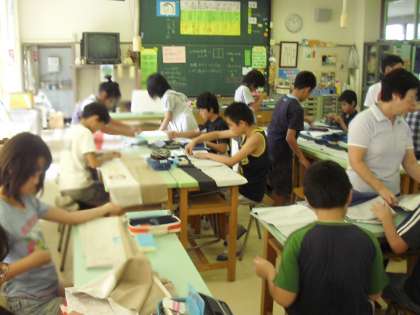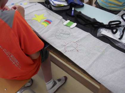家庭科で、6年生が「エプロン」を作成しています。自分のアイデアで刺繍もしています。