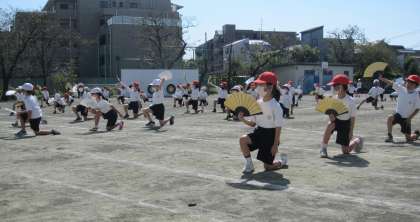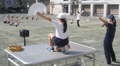 ダンス『百本桜〜祝いの舞〜』に取り組んでいます。クラスごとに考えたポーズを紹介し合い、演技に取り入れました。扇子が太陽に照らされてきれいです。