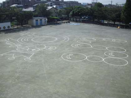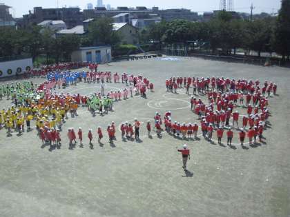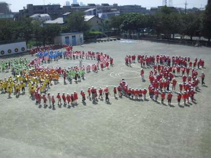 快晴の今日、開校50周年の記念の航空写真と、全校の集合写真を撮りました。朝から業者の方に50周年のロゴマークを校庭に描いていただき、選考の子どもたちは、色分けしたエプロンを付け、セスナ機で撮影しました。暑い中でしたが、出来上がりが楽しみです。