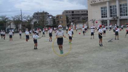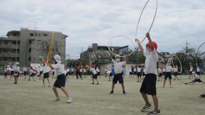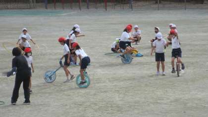フラフープ、ボール、一輪車を操作しながら演技をします。一人一人の技能が向上し、全体で動きがそろったときは、とてもきれいです。