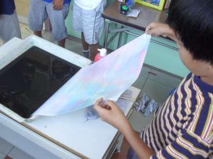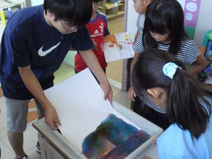 都市大学の実習生と一緒に3年生が展覧会の作品の一部「マーブリング」で世界に1枚の模様を作成しました。