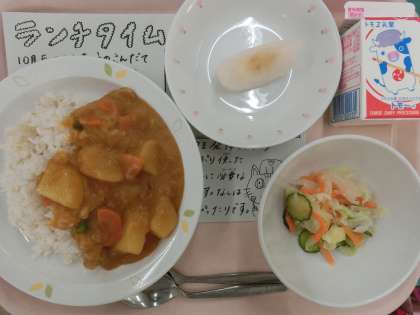 今日の給食は、ポークカレーライス、牛乳、フレンチサラダ、くだもの(なし)です。
