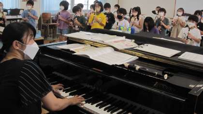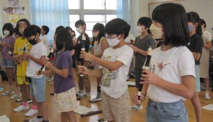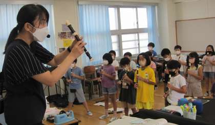 リコーダーの指使いの練習をしました。上手にできるようになると、「担任の先生にも見てもらいたい」という声が上がっていました。