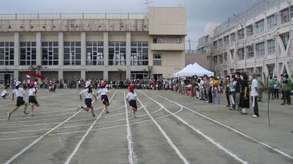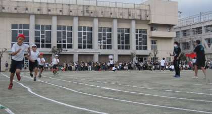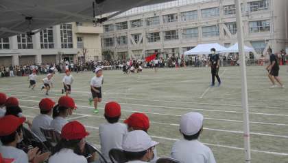 開校60周年記念学年別運動発表会が開会しました。始めは、3年生80m走です。たくさんの保護者の皆様、子どもたちの応援が嬉しいです。