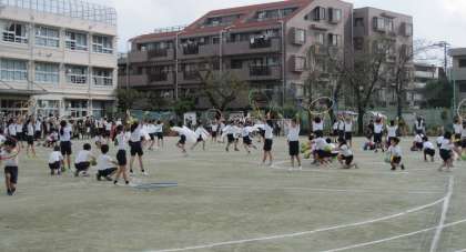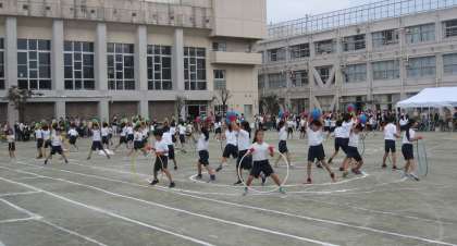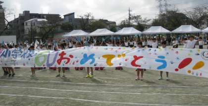 3年生『つなぐ〜玉堤の未来へ〜』 場面の構成が物語の展開のように進んでいきました。演技の最後に横断幕を広げて開校60周年を祝いました。