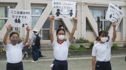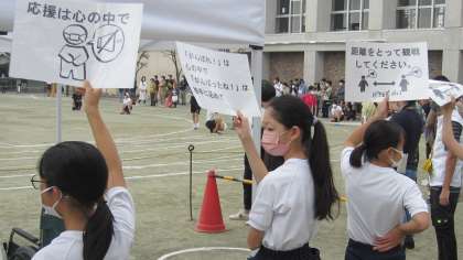 学年別運動発表会を6年生児童が支えました。いくつかの係を紹介します。写真は、感染症対策として、呼びかけをしているところです。