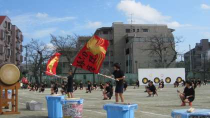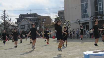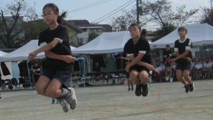 6年生『朋 〜同じ空の下〜』始まりは、短縄から。難しい技も身に付けて、リズムに合わせて跳び続けることができました。