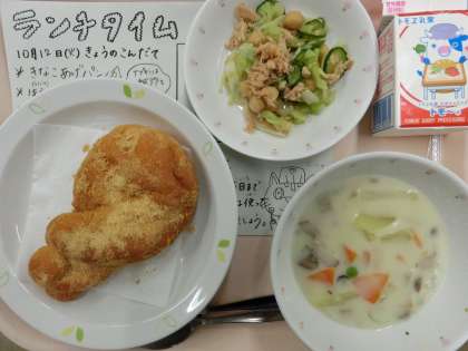 今日の給食は、きなこあげパン、牛乳、ビーンズサラダ、森のチャウダーです。
