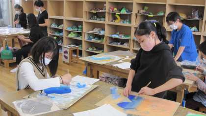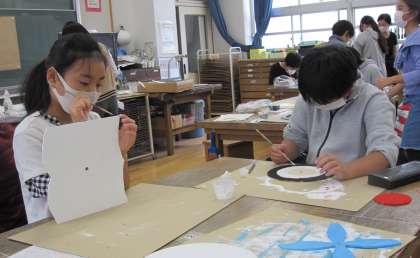 「時を刻む」時計づくりの4時間目の授業です。今日のめあては『筆づかいや色合い、材料などを工夫して表現しよう』です。それぞれの工程の作業に夢中になって取り組んでいました。