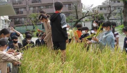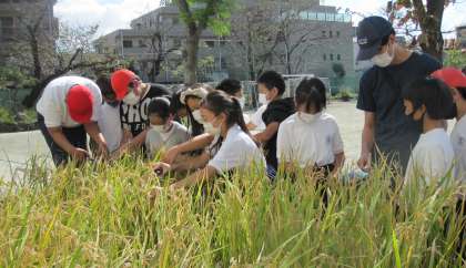4月から育ててきた稲が豊かに実りました。稲や穂の触り心地を確かめながら楽しそうに稲刈りをすることができました。おやじの会の皆様、理科支援員の方には、育苗のセッティングやネット張りなどでご支援をいただき、ありがとうございました。子どもたちにとって、貴重な体験活動ができました。