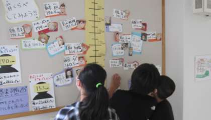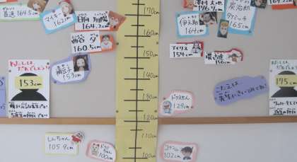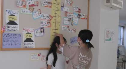子どもたちは、有名人やアニメのキャラクター、教員との身長比べを楽しんでいます。