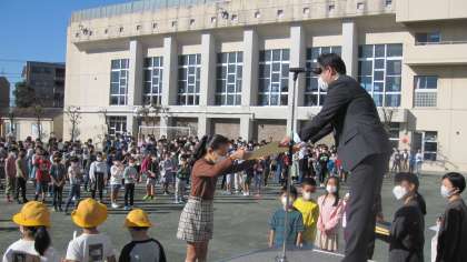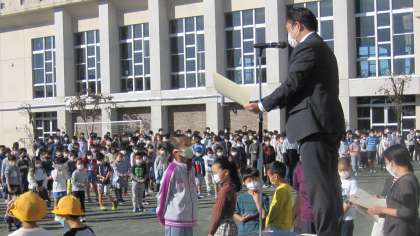 雲一つない晴天のもと、校庭で全校朝会を行いました。全校の子どもたちが一堂に会するのはとても気持ちが良いものだと感じました。本日は、「はたらく消防の写生会」の絵のコンクールで入選した児童の表彰も行いました。