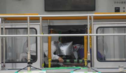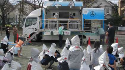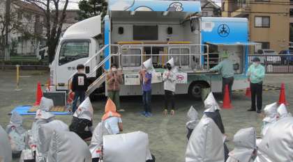 地震を想定した避難訓練を実施しました。4年生は、代表者が起震車「ナマズ号」に乗り、震度7を体験しました。緊急地震速報の後、どのように行動したらよいのか、学ぶことができました。