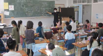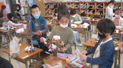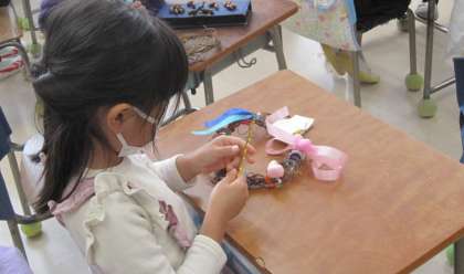 『秋のリースづくり』をしました。拾ってきた栗、まつぼっくり、どんぐり、もみじ…と、毛糸、モール、綿やリボンなどを組み合わせて、楽しそうに作っていました。