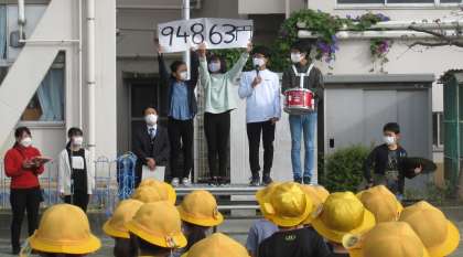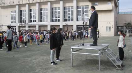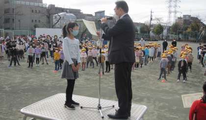 全校の子どもたちとのあいさつから1日がスタートしました。「世田谷区児童画作品展」で入選した児童の表彰、代表委員からは、ユニセフ募金協力へのお礼と成果の発表がありました。