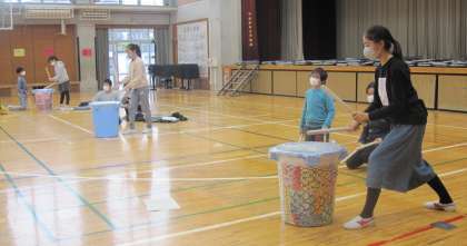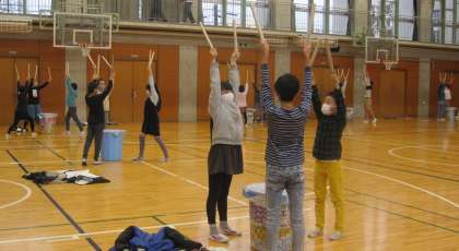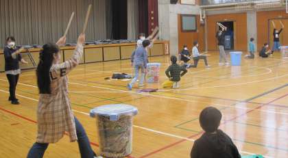 『龍神太鼓』に熱心に取り組んでいます。チームの友達とのコンビネーションが上達しました。リズミカルな太鼓の音が体育館に響いています。記念式典当日が楽しみです。