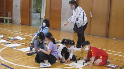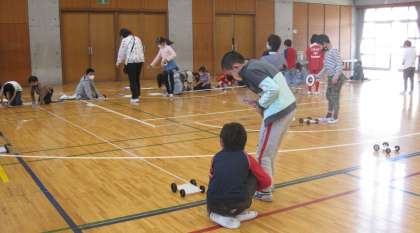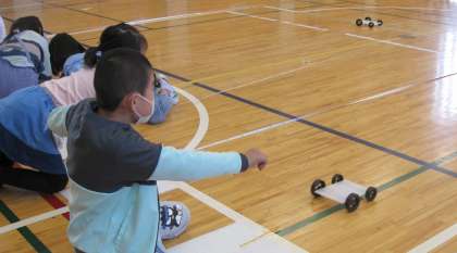 「ゴムのはたらき」の学習をしています。風やゴムの力で動く自動車を使って実験しました。ゴムを10cm伸ばしたときと15cm伸ばしたときの自動車が走る距離を計測して、比較しました。