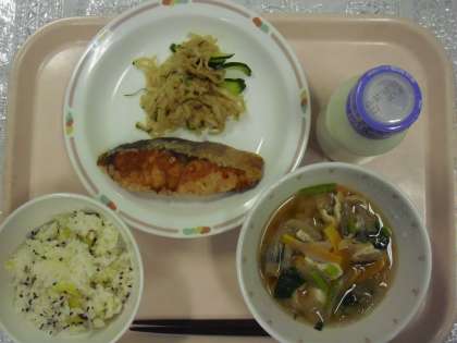今日のメニューは、サツマイモご飯、鮭の竜田揚げ、ハリハリ漬け、味噌汁、牛乳でした。