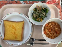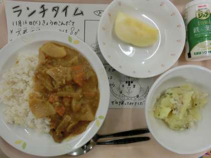 今日の給食は、大蔵大根のカレーライス、ジョア(マスカット)、ジャーマンポテト、くだもの(りんご)です。