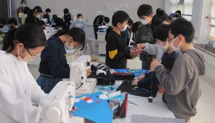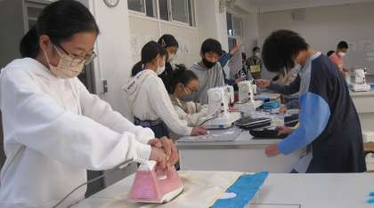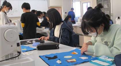 『楽しくソーイング』クッションづくりに取り組んでいます。友達と教え合い、助け合いながら、楽しそうに真剣に作製している姿が印象的でした。展覧会が楽しみです。