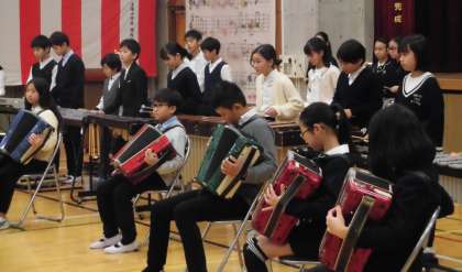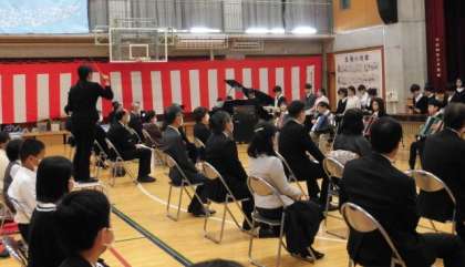 写真は、マツケンサンバの演奏です。在校生代表として、6年生は立派に役割を果たしていました。6年生にとっても74名の仲間と作り上げた式典は、一生の思い出になったことと思います。