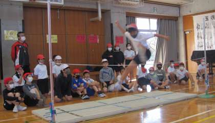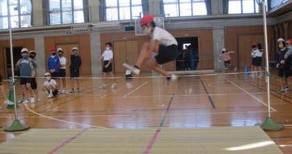 走り高跳びに取り組んでいます。「イチ、ニ、イチ、ニ、サーン」のリズミカルな5歩助走で、跳び越していました。