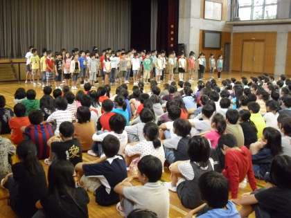 4年生が日本語の学習の成果として、朝会で「徒然草」の暗唱を行いました。
