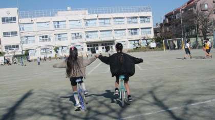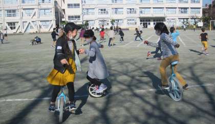 低学年、中学年の子どもたちは、一輪車の技に挑戦したり、ボール遊びを楽しんだりしていました。