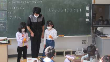 『いろいろな音を見つけてならそう』 担任の演奏を見て、意欲が高まりました。最後は、打楽器の音のリズムに合わせて、体を動かして表現しました。