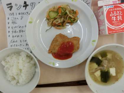 今日の給食は、ごはん、牛乳、もうかざめのチリソース、大根と昆布のサラダ、わかめスープです。