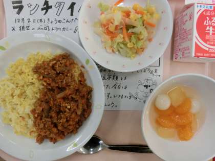 今日の給食は、根菜の和風ドライカレー、牛乳、コーンサラダ、フルーツ白玉です。