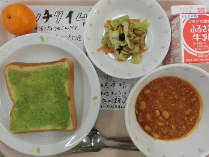今日の給食は、小松菜ビスキュイトースト、牛乳、キャベツのソテー、チリコンカン、くだもの(みかん) です。