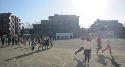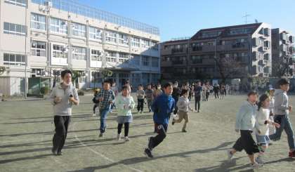 朝は自主的に取り組む時間です。たくさんの子どもたちと教員が一緒に走っています。