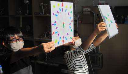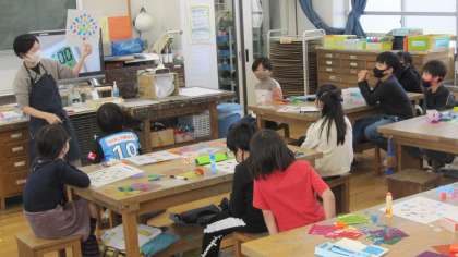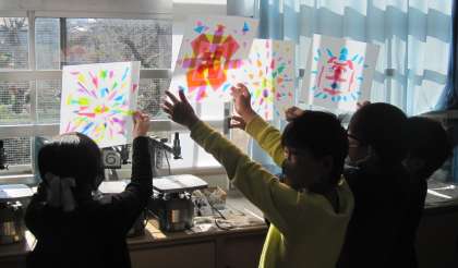 光の花〜お祝いの花〜 を制作しています。今日のめあては「光にすかしながら花を表そう」です。子どもたちは、自分の作品を光にすかしながら、さらにイメージを膨らませていました。