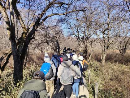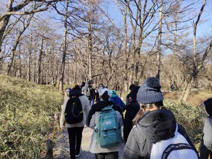 赤沼周辺をハイキングしています。東京とは違い、足元にはたくさんの霜柱が見られました。これから、戦場ヶ原を歩きます。