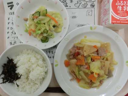 今日の給食は、ごはん、牛乳、ひじきのふりかけ、大蔵大根のうま煮、ツナと枝豆のサラダです。