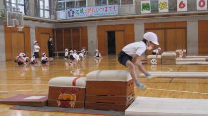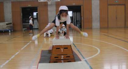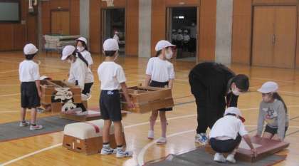 跳び箱2連結の工夫した場で、跳び箱あそびを楽しみました。ダイナミックに跳び越している子もいました。準備、片付けも友達と分担して、安全に留意してできるようになりました。