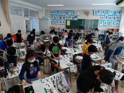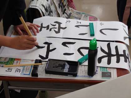 書き初めの、「美しい空」を練習しました。普段より半紙が長いので、字の大きさや形に注意して書きました。(12月11日)