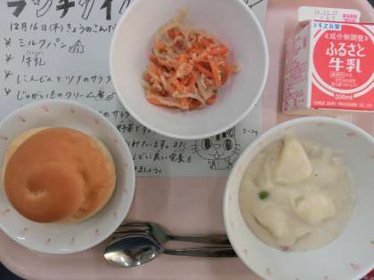今日の給食は、ミルクパン、牛乳、にんじんとツナのサラダ、じゃがいものクリーム煮です。