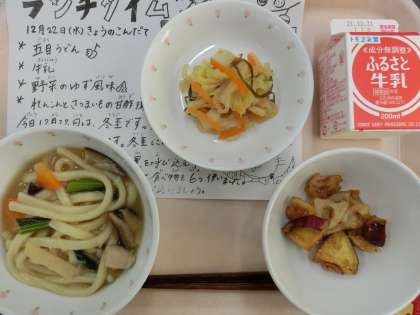 今日の給食は、五目うどん、牛乳、野菜のゆず風味、れんこんとさつまいもの甘酢揚げです。