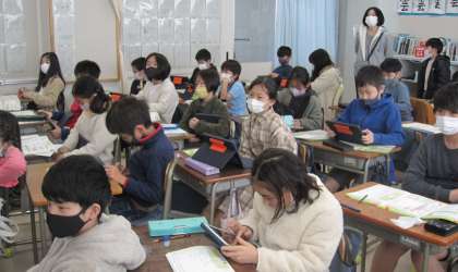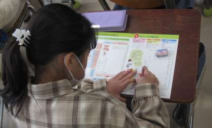 賀詞、本文、結びに分けて、例文を参考にしながら、今年お世話になったことのお礼や来年の目標など、自分で工夫した文章を書いていました。友達同士、書いた内容を共有しました。