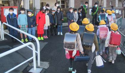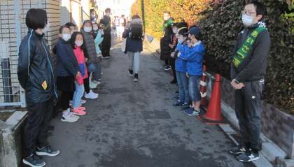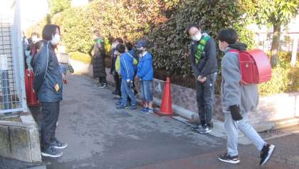 翠と溪の学び舎「尾山台中学校、尾山台小学校、玉堤小学校」3校合同であいさつ運動を実施しています。3学期は3年生と1年生が担当しています。PTAの皆様にもご協力をいただいています。担当学年の子どもたちは、気持ちを込めてあいさつをしていました。
