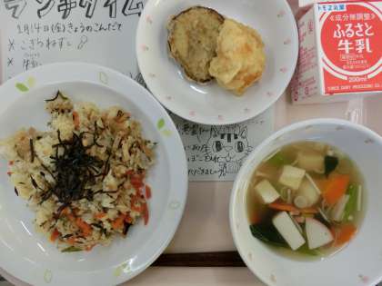 今日の給食は、こぎつねずし、牛乳、天ぷら(いか、さつまいも)、もち入りすまし汁です。