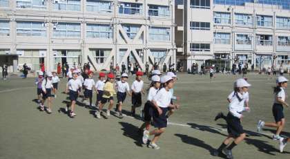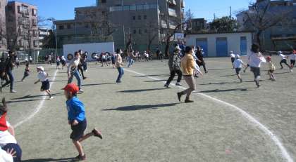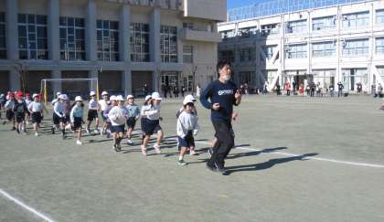 1年生は校庭6周の集団走を実施しました。子どもたちは保護者の皆様に見守られながら、一生懸命がんばっていました。後半の時間は、お父さん、お母さんと一緒に鬼ごっこをして、思い切り体を動かし楽しみました。