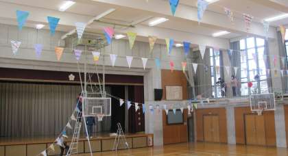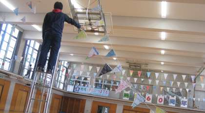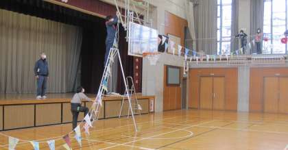 体育館を展覧会会場へ。本日から、体育館で展覧会の会場づくりを始めました。