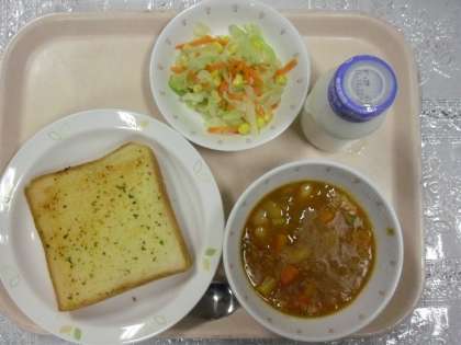昨日のメニューは、ガーリックトースト、ポークビーンズ、コーンサラダ、牛乳でした。
