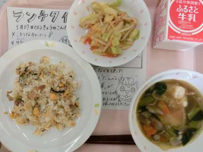 今日の給食は、こまつなチャーハン、牛乳、糸寒天のごま酢あえ、のらぼう汁です。