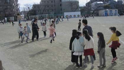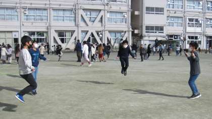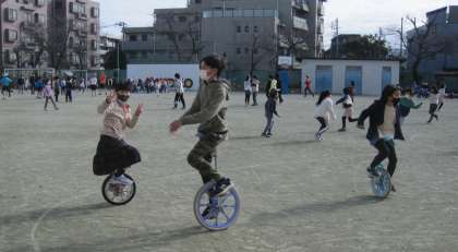 子どもたちは感染症対策をしながら、工夫して遊んでいます。縄跳びや一輪車が人気です。