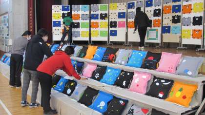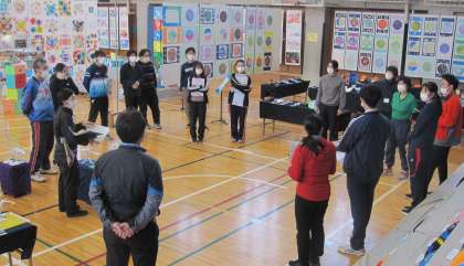子どもたちの作品や名前、題名等を一人一人確認していきました。教職員が会場を整え、最後の確認を行いました。明日は、児童鑑賞日です。