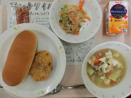今日の給食は、コッペパン、オレンジジュース、いちごジャム、コロッケ、大根サラダ、豚汁です。